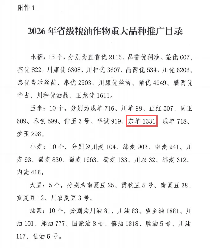 遼寧東亞種業(yè)自主培育的東單1331入選四川省2026年糧油作物重大品種推廣名錄。